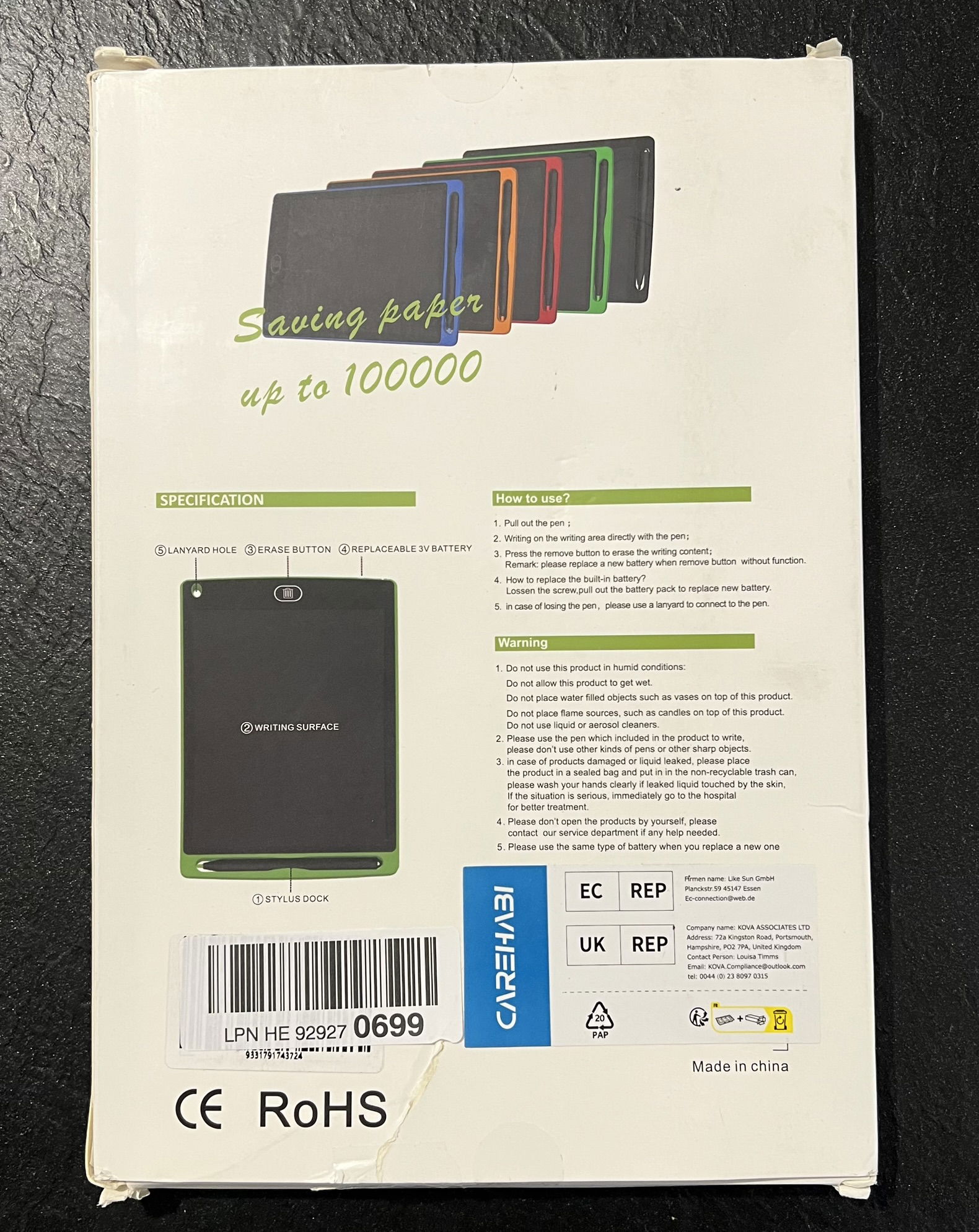 - Lekka i przenośna: Tablica do pisania LCD jest wodoodporna i odporna na upadki. Tablica bazgrołowa jest lekka i łatwa do przenoszenia, łatwa do umieszczenia w torbach podróżnych i torbach, odpowiednia na wiele okazji: do salonu, samochodu, samolotu, na zewnątrz.