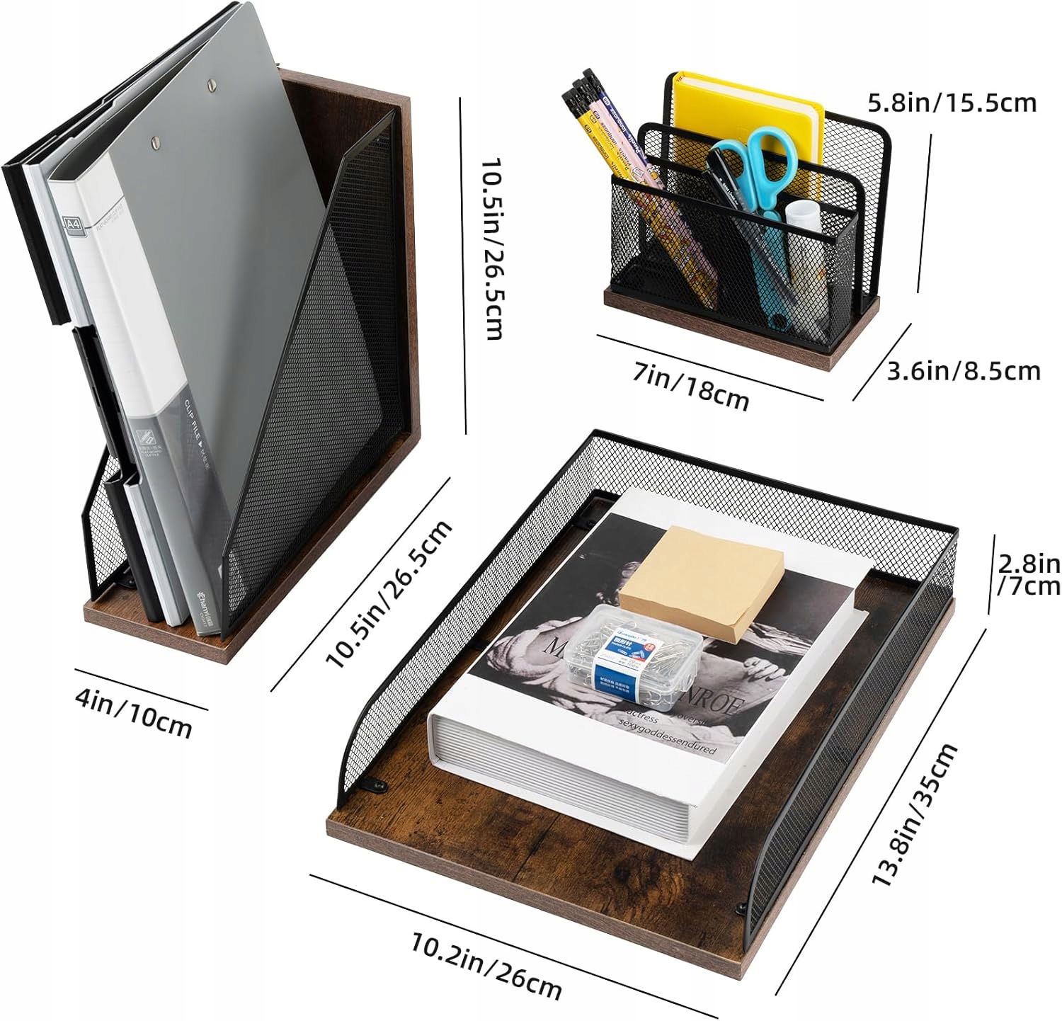 Zestaw 3 artykułów biurowych z drewna i siatki w stylu vintage – tacka na listy, pojemnik na czasopisma, uchwyt na długopisy i sorter do listów, zestaw organizerów na biurko, akcesoria do dekoracji biurka