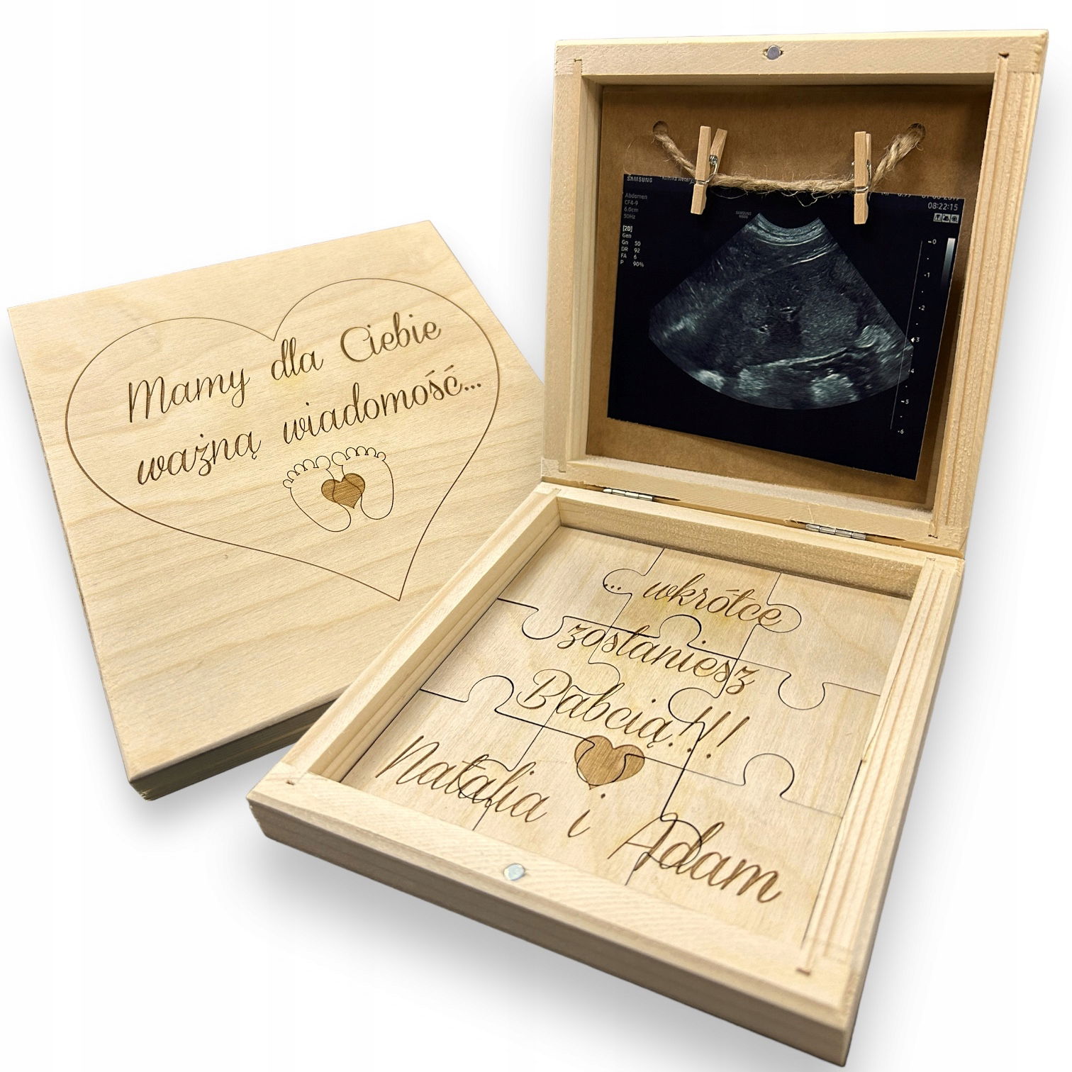 • Skrzyneczka z naturalnego drewna ze zdjęciem USG waszego maluszka, wydrukowanym i umieszczonym na wnętrzu wieczka. Dół pudełka zdobi piękna kartka z informacją o zastaniu dziadkami oraz planowaną datą narodzin dziecka i drewnianym serduszkiem.