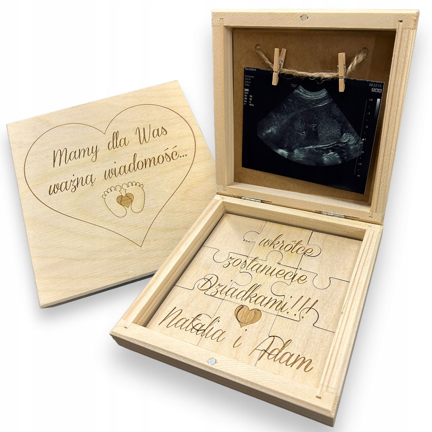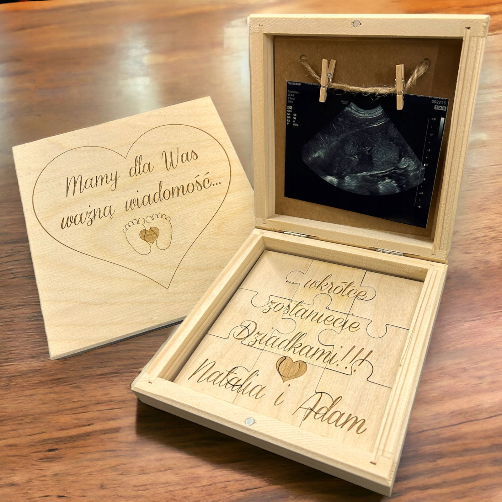 • Skrzyneczka z naturalnego drewna ze zdjęciem USG waszego maluszka, wydrukowanym i umieszczonym na wnętrzu wieczka. Dół pudełka zdobi piękna kartka z informacją o zastaniu dziadkami oraz planowaną datą narodzin dziecka i drewnianym serduszkiem.