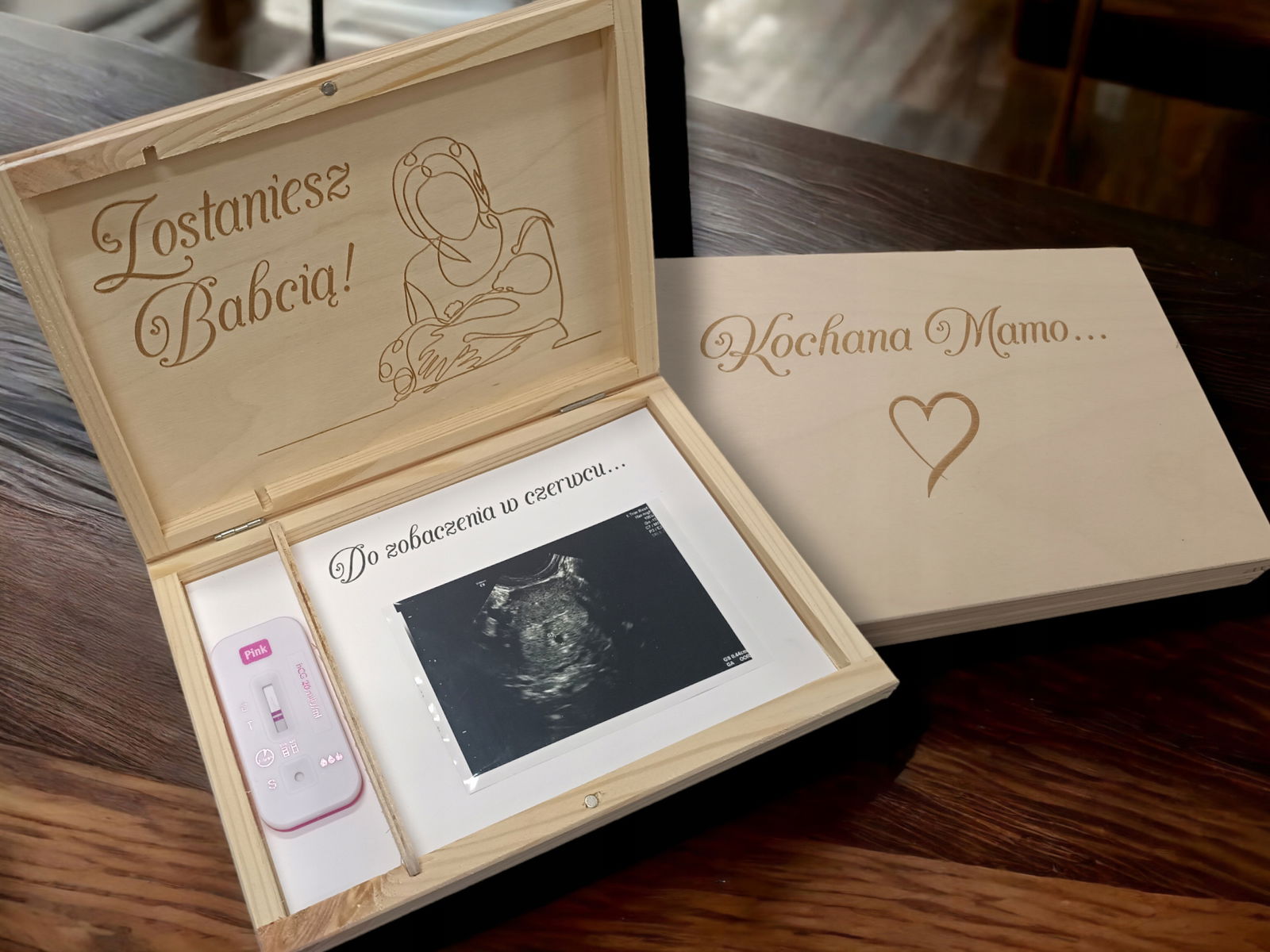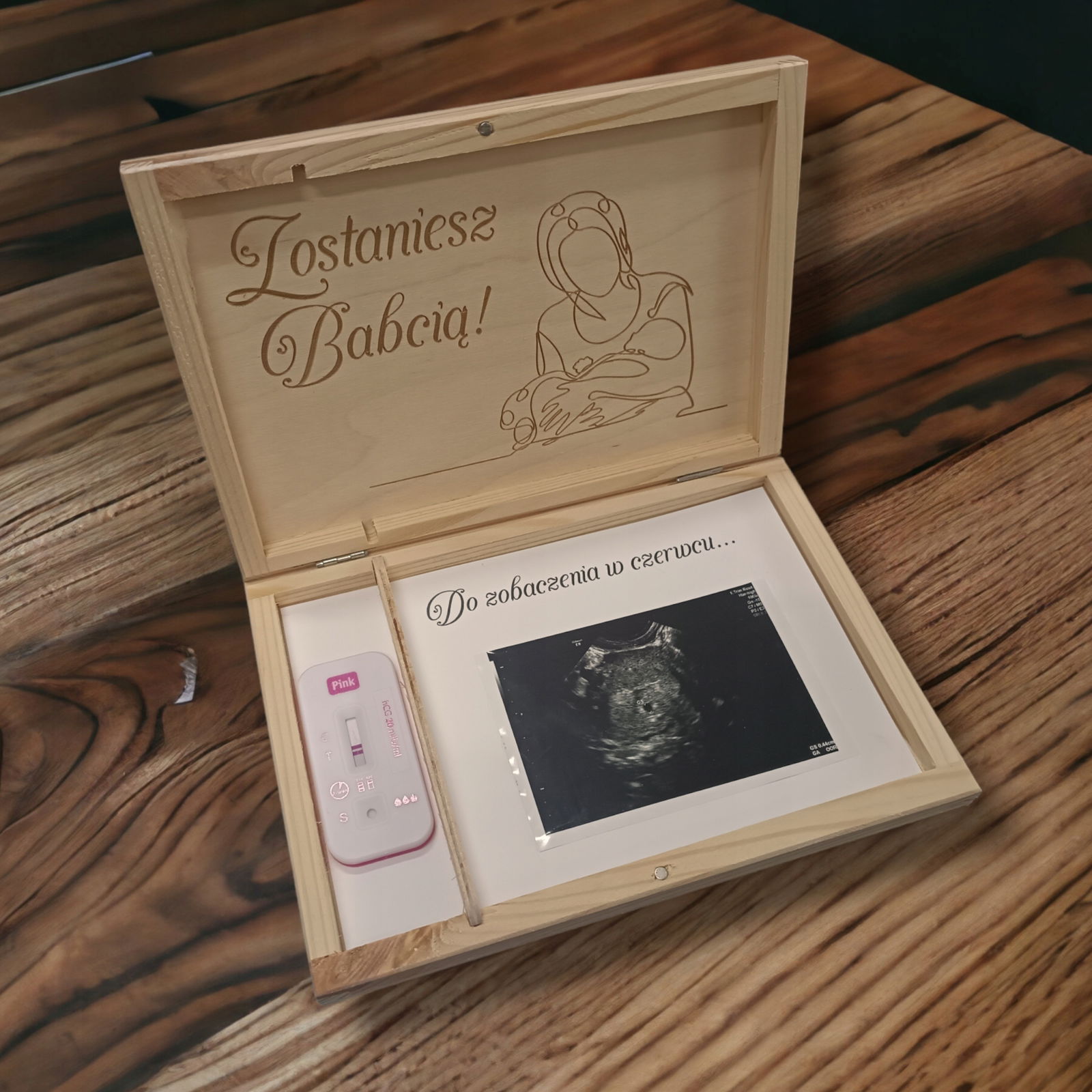 Powiadom swoją mamę w oryginalny sposób, że zostanie babcią. Wręcz jej pudełeczko z grawerem i zdjęciem USG maluszka w środku. Takie przekazanie cudownej informacji z pewnością wzruszy ją do łez. Pięknie przygotowane drewniane pudełko będzie dla niej trwałą pamiątką na długie lata.