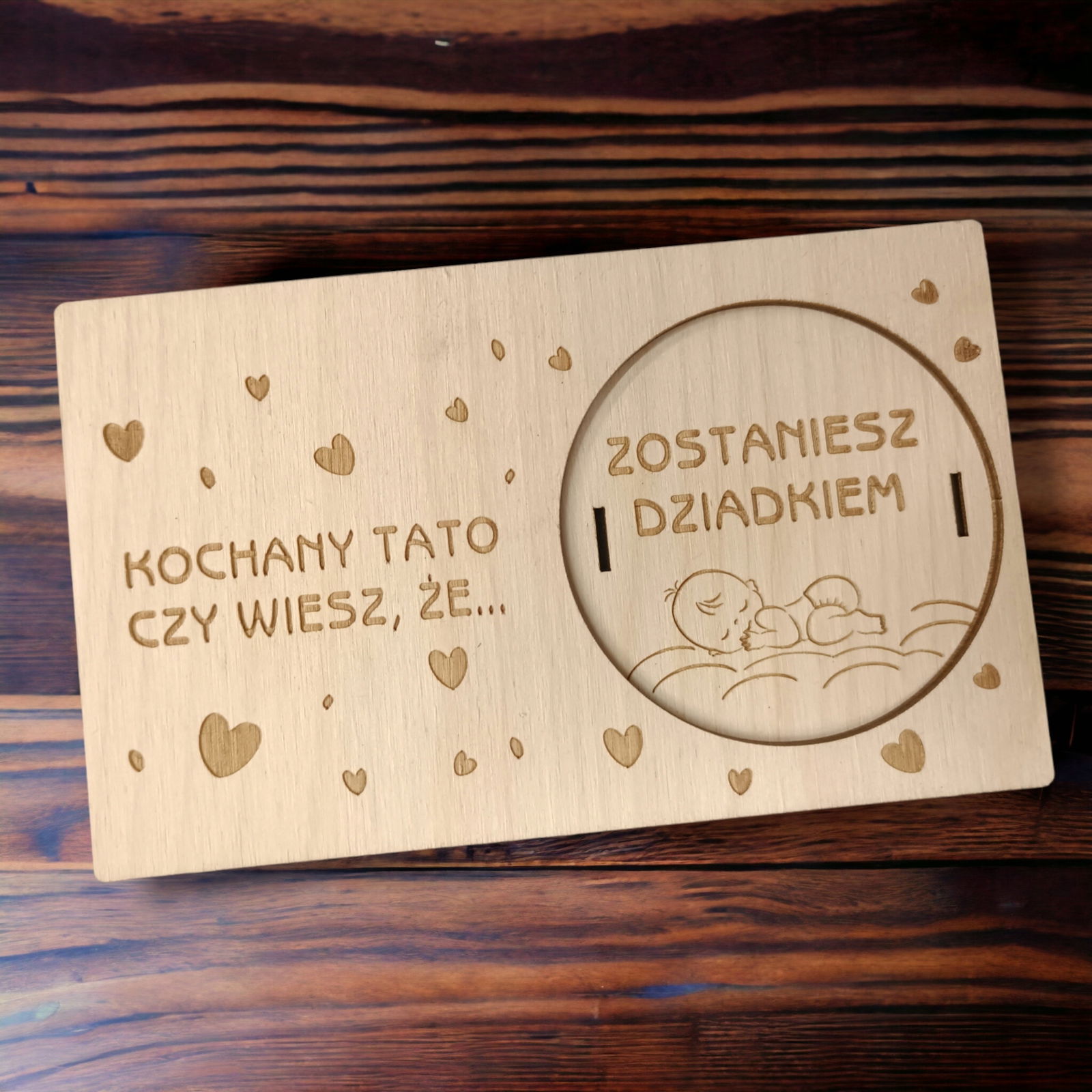 Powiadom swojego tatę w oryginalny sposób, że zostaną Dziadkiem. Wręcz jemu tabliczkę niespodziankę z grawerem. Takie przekazanie cudownej informacji z pewnością wzruszy go do łez.