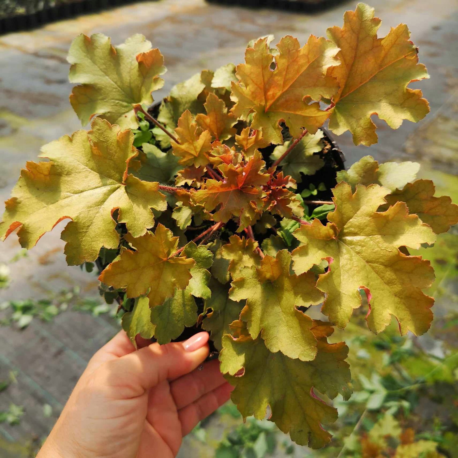 Żurawka Heuchera 'Marmalade' to jedna z najbardziej efektownych odmian żurawek, która przyciąga wzrok ciepłą paletą kolorów liści – od miedziano-pomarańczowych po złocisto-brązowe, często z delikatnym, różowym podbiciem. Jej kępiasty, dekoracyjny pokrój i długie, ażurowe kwiatostany czynią ją nie tylko ozdobą rabat, ale i eleganckim dodatkiem do kompozycji pojemnikowych. ✨ Odmiana ‘Marmalade’ jest jak słoneczny akcent w cienistym zakątku ogrodu.