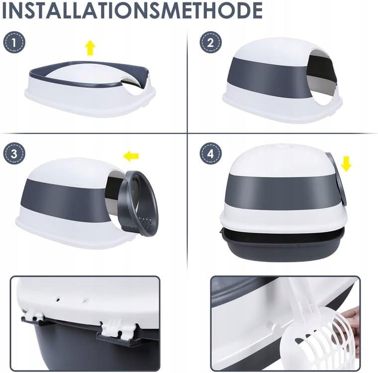 - Duża kuweta dla kota z pokrywką o wymiarach 41 x 54 x 40 cm ma osobną konstrukcję, którą można zainstalować w ciągu 5 minut bez użycia narzędzi. Jest to dobry pomocnik przy wyjmowaniu kota.