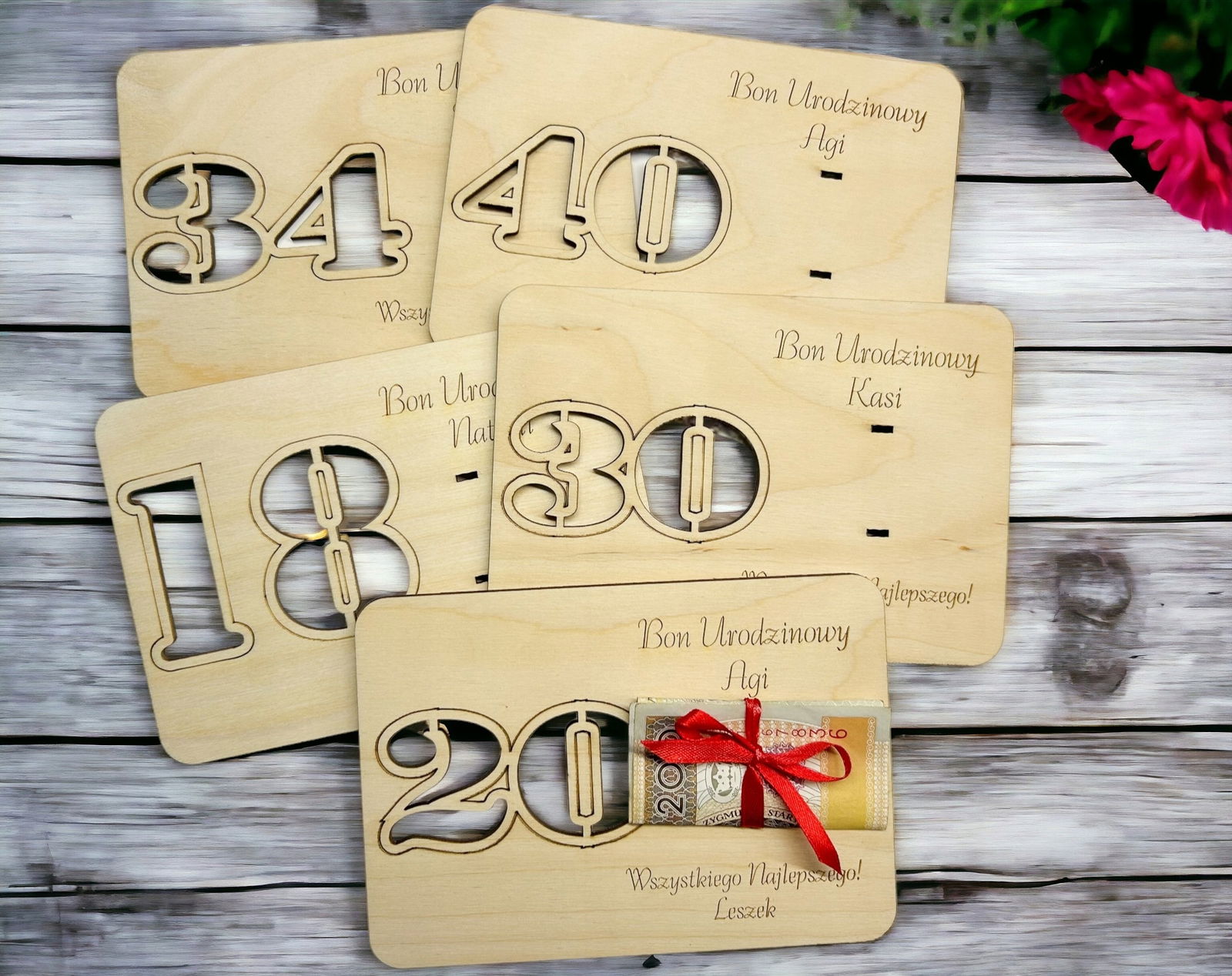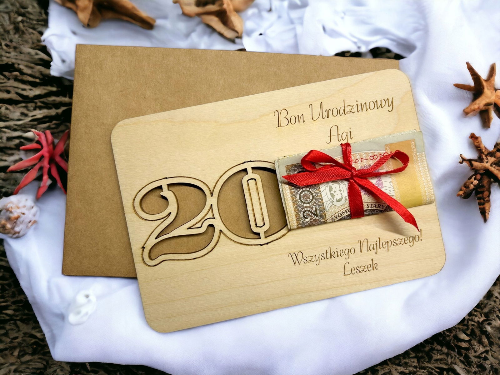 Nasz drewniany bon, voucher na pieniądze to super pomysł na wręczenie pieniędzy bliskiej osobie w dekoracyjny i oryginalny sposób.