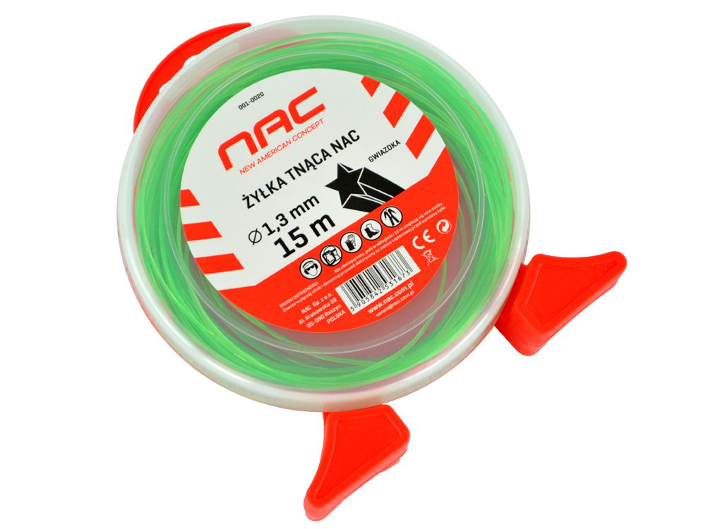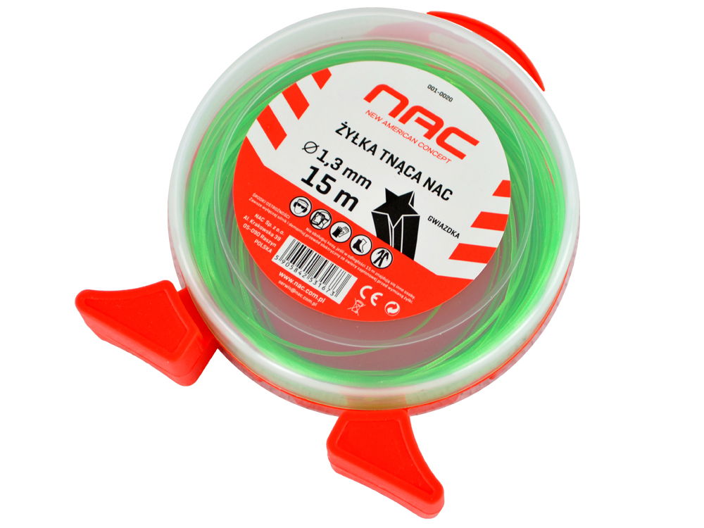 Żyłka tnąca do kos i podkaszarek NAC 001-0020 - przekrój gwiazdki - o grubości 1.3 mm i długości 15 metrów.