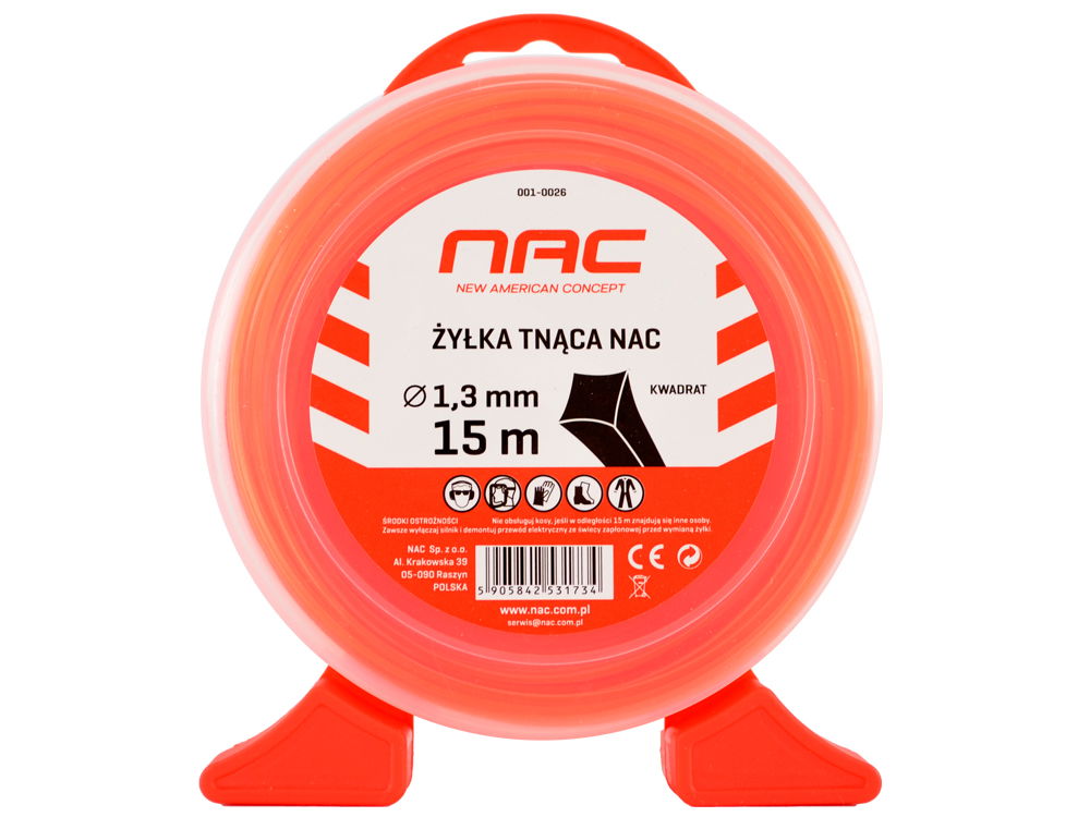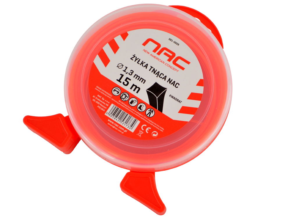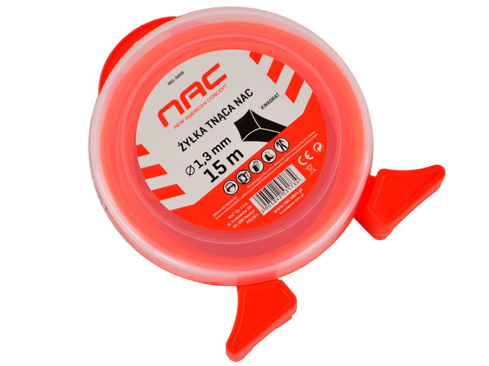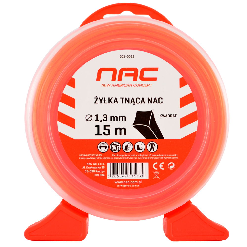 Żyłka tnąca do kos i podkaszarek NAC 001-0026 - przekrój kwadratowy - o grubości 1.3 mm i długości 15 metrów.
