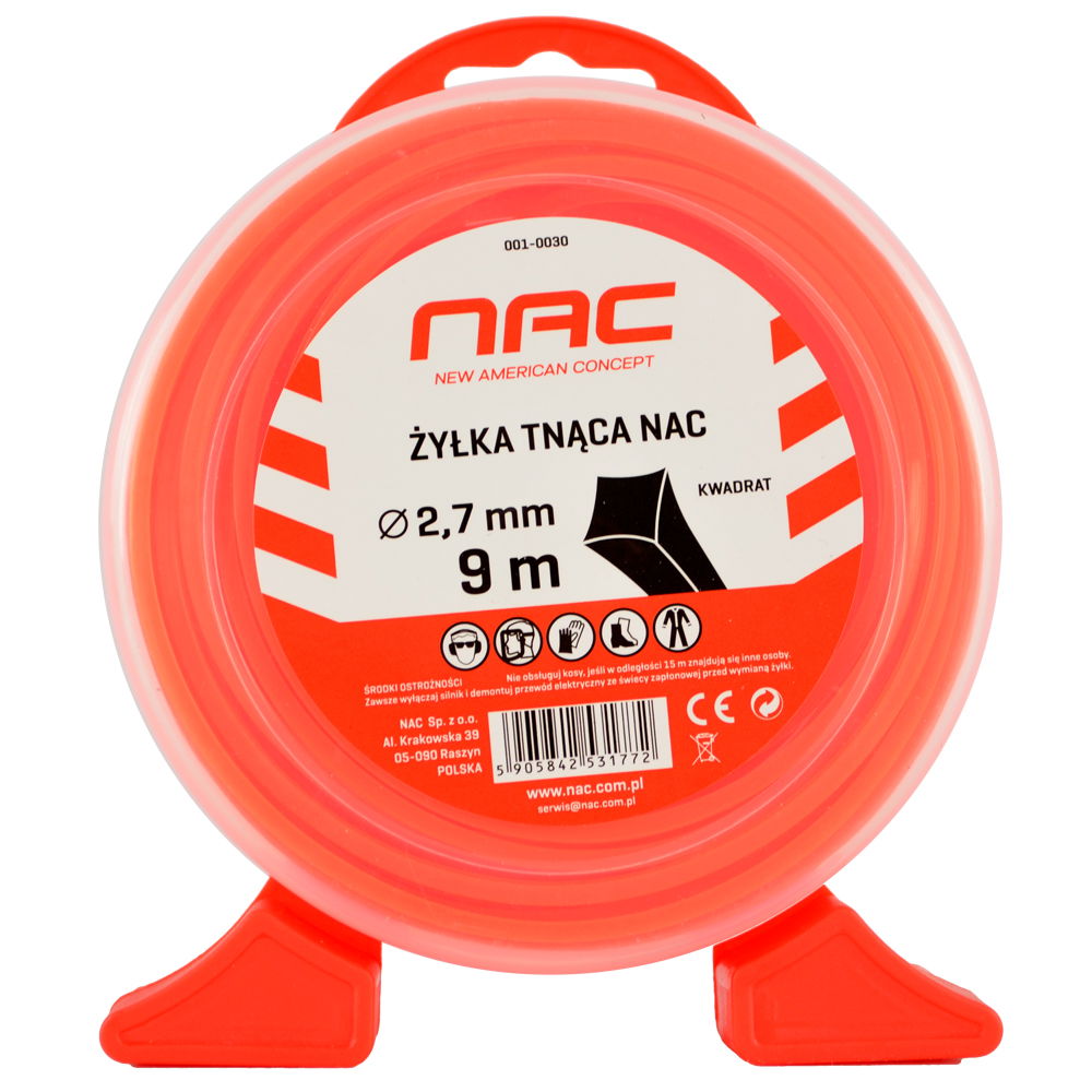Żyłka tnąca do kos i podkaszarek NAC 001-0030 - przekrój kwadratowy - o grubości 2,7 mm i długości 9 metrów.